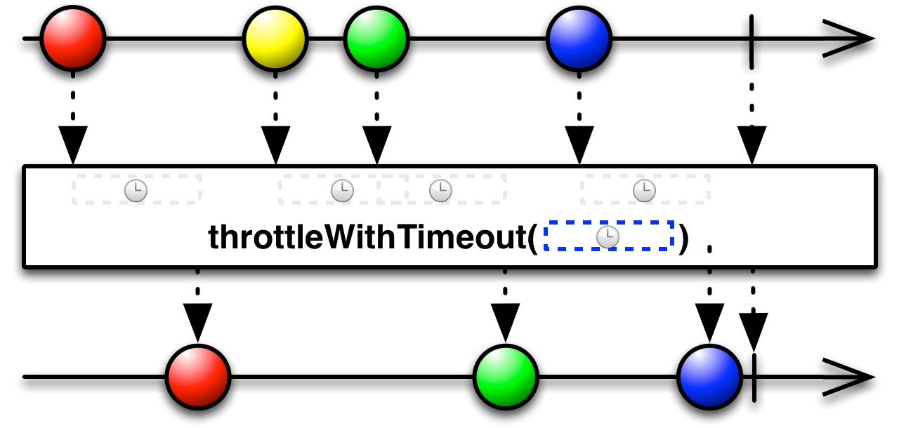 By drawing the diagram we can see that we will need some kind of delay after the user input, before firing of another asynchronous call. The delay in this sample maps to the throttle operator. To create another observable sequence from an observable sequence we will use the flatMap or selectMany operator. This will lead to the following code: